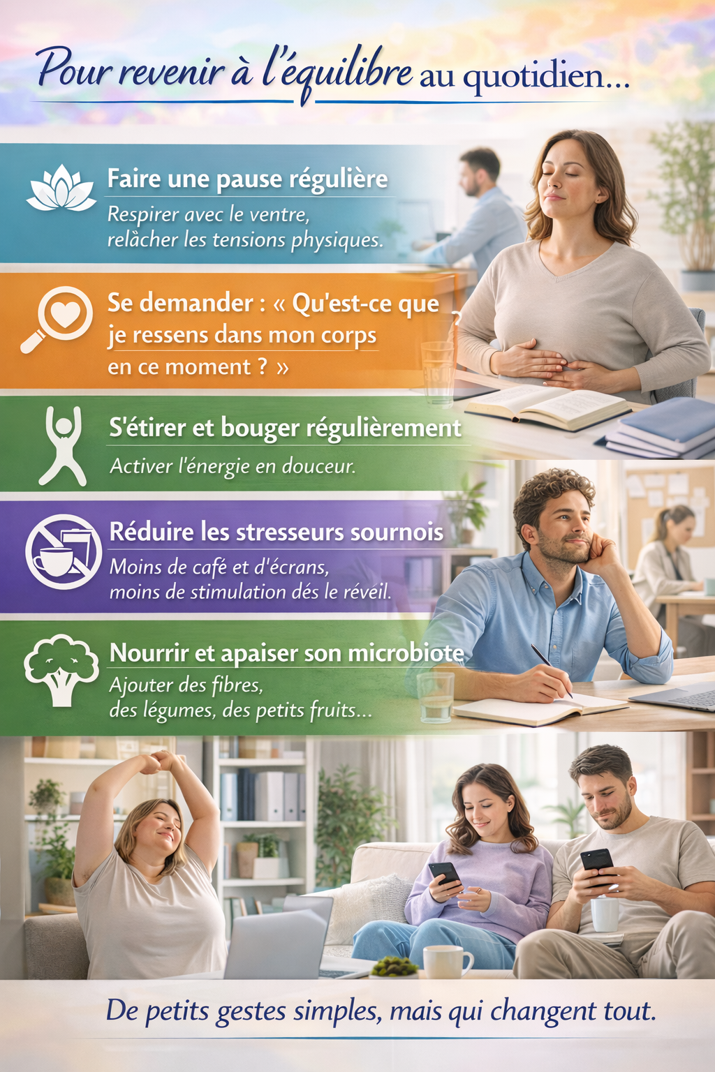 Réduire les stresseurs sournois aussi : trop de café, trop de stimulation, le téléphone dès le réveil…